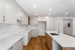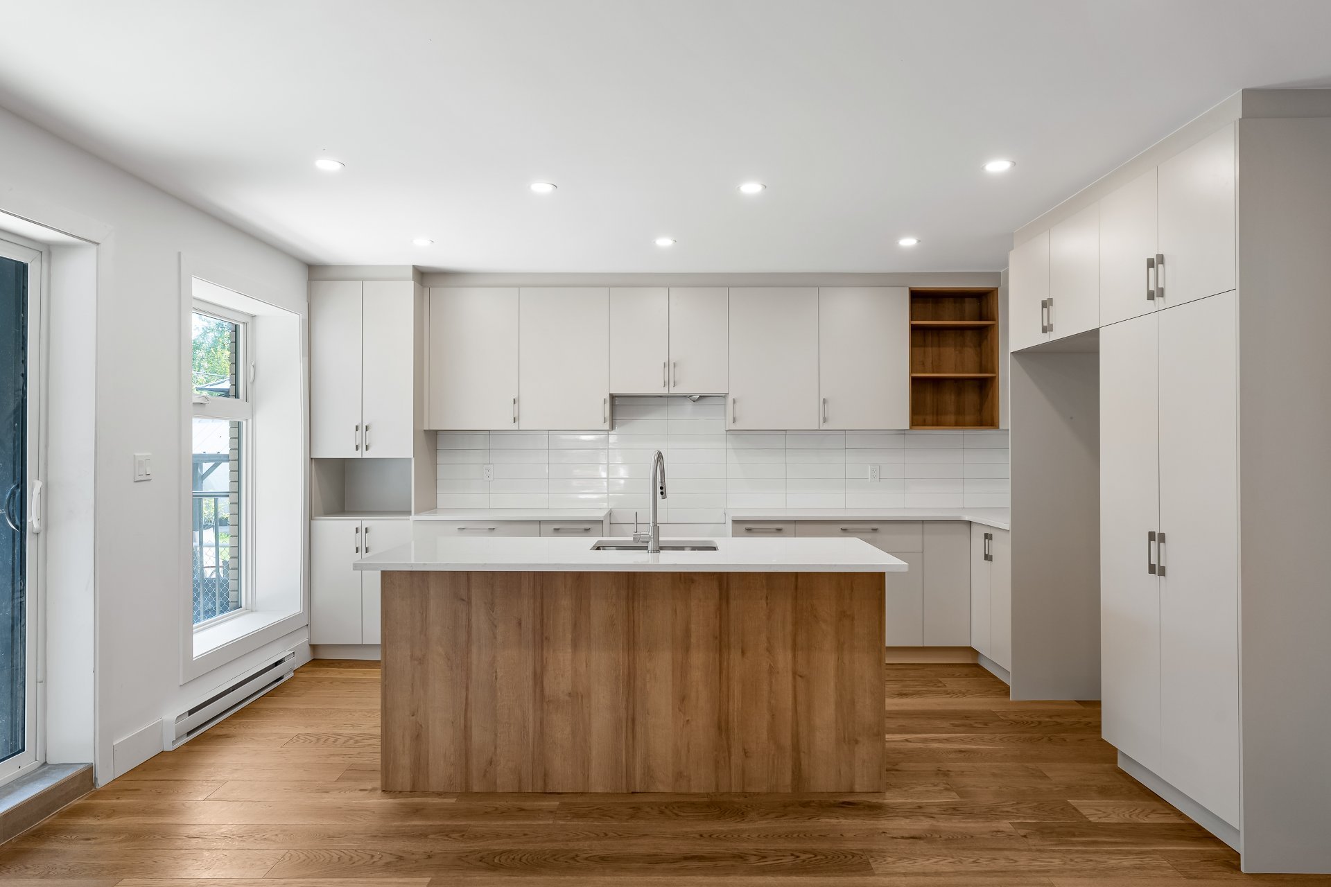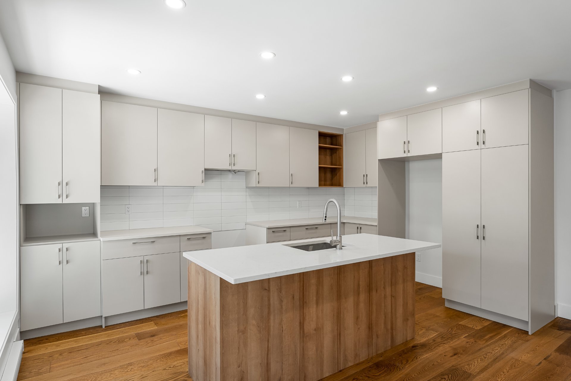 Cuisine neuve avec des finitions contemporaines, un grand plan de travail et des placards.